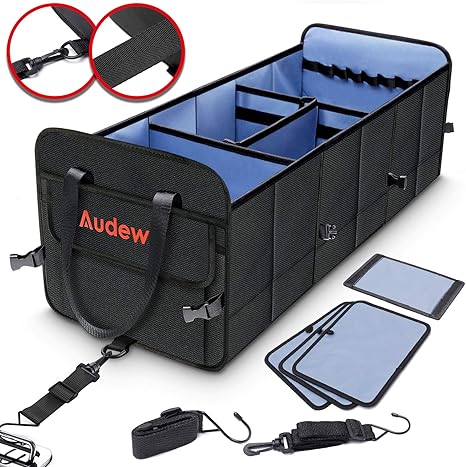 Audew Trunk Organizer 3 Large Compartments Collapsible Car Storage Box With Tie Down Straps 1680d Oxford Cloth Waterproof Non Slip Bottom With