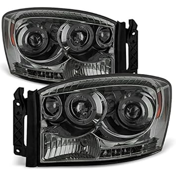 For Dodge Ram Pickup Truck Smoked Smoke Dual Halo Ring Led Projector Headlights Left Right Replacement