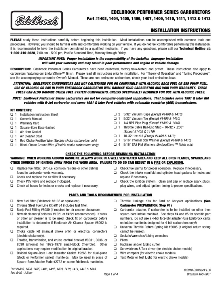 Edelbrock 1406 Carburetor Installation Instructions Jegs